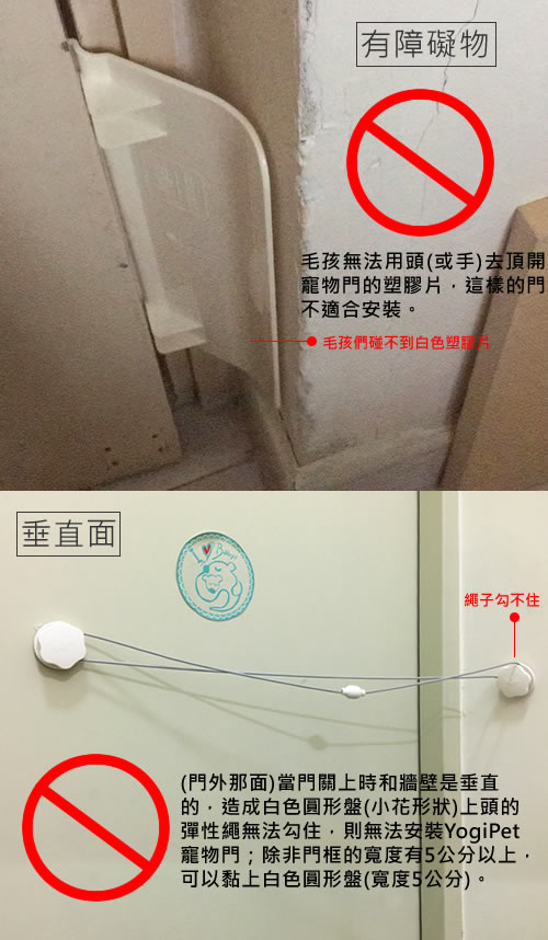 ★每款門都適合使用嗎?推拉門無法使用,其它臥室門和洗手間門則可以;特別注意的是門開關進出的位置,如果門開關進出的位置較靠近牆面,或是進出的地方有放置櫃子(無法移動的傢俱),則無法使用,以免毛孩因空間太小,進出受到阻礙,而無法順利出去。