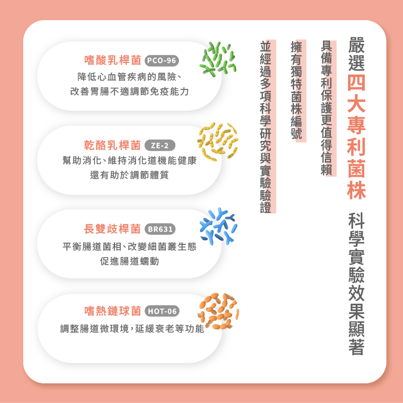 益生菌不只是腸胃保健!我們透過四株核心活性益生菌(Lactobacillus casei、L. acidophilus、B. infantis、S. thermophilus),協助:
