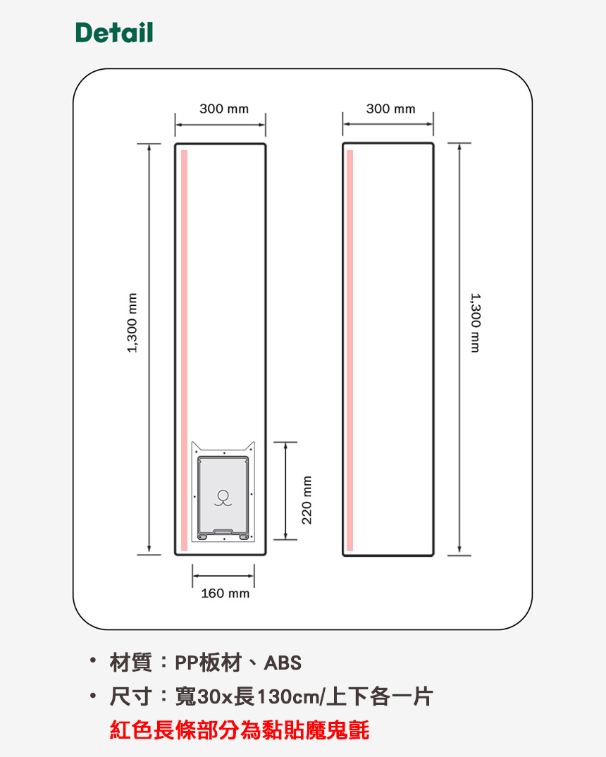尺寸:共兩片板材,每片約30x130cm,洞口約寬度16x高度24cm